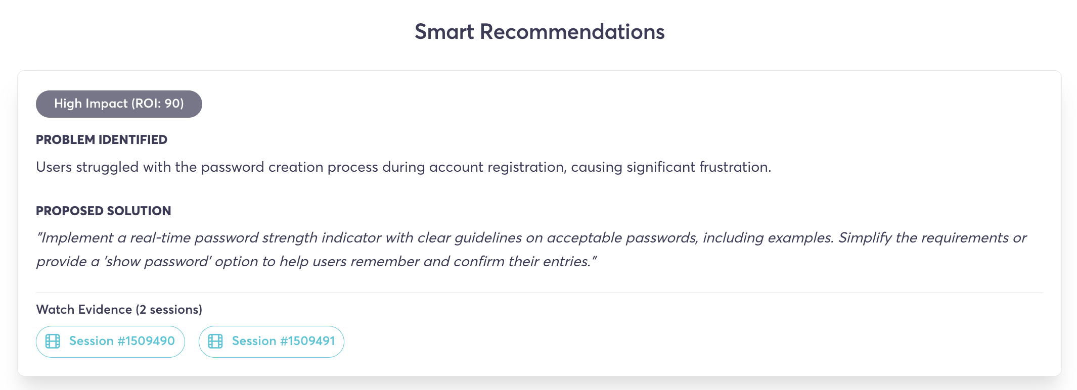 The AI analyzes your sessions in the background. It identifies patterns of friction—like a confusing "Submit" button or a broken filter—and serves them to you as a prioritized list.
